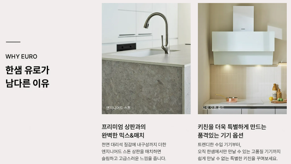 이 글에서는 더 많은 소비자들이 접근할 수 있는 보급형 유로라인을 기준으로 설명하겠습니다. 다만, 이러한 구분은 한샘뿐만 아니라 다른 브랜드에도 비슷하게 적용될 수 있으므로, 참고하시면 좋습니다.