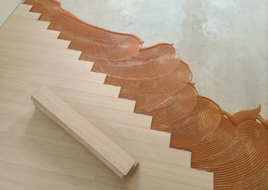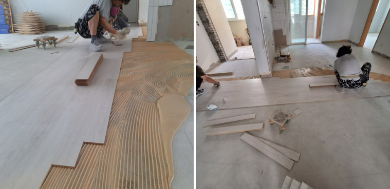 문 확인 및 청소 단계에서는 문틀, 문 하단, 벽 하단 부분을 체크합니다. 이는 마루와 문, 벽 사이의 간격을 정확히 맞추기 위함입니다. 실제 시공 단계에서는 바닥에 본드를 고르게 도포한 후 마루를 설치합니다. 이때 마루 사이의 틈새가 생기지 않도록 주의깊게 작업합니다.