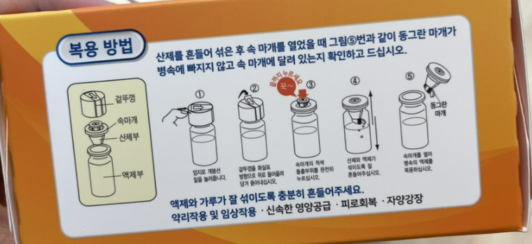 - 개봉 방법: 병뚜껑을 연 후, 분홍색 속마개를 아래로 눌러 분말과 액체가 완전히 섞이도록 합니다.