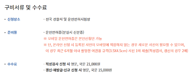 면허증과 다른 사진으로 교체할 경우가 아니라면 사진은 다시 찍을 필요 없습니다. 해외 54개국에서 쓰이는 국제면허증은 15,000원의 비용, 국내에서 사용되는 모바일 운전면허증은 13,000원 발급비용이 소요됩니다.