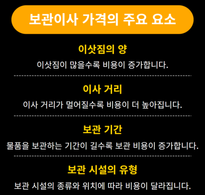 4) 일반 이사보다 높은 비용: 두 번의 이사 과정과 보관 비용으로 인해 일반 이사에 비해 비용이 높습니다. 하지만 이는 제공되는 서비스의 범위가 더 넓기 때문입니다.