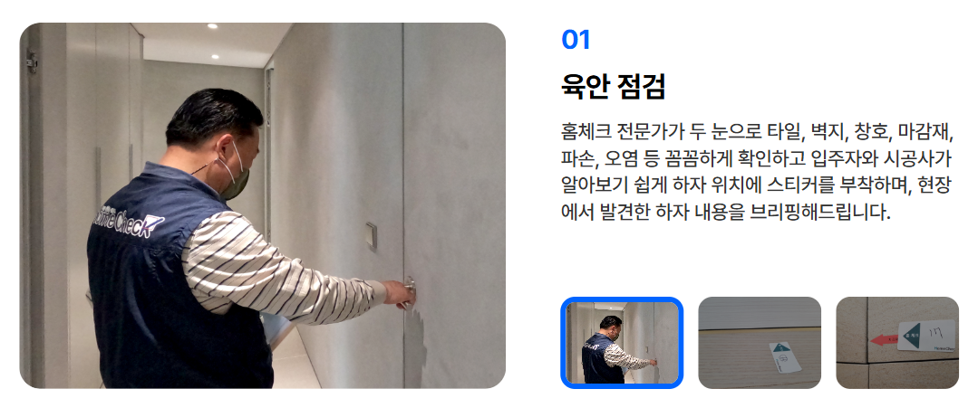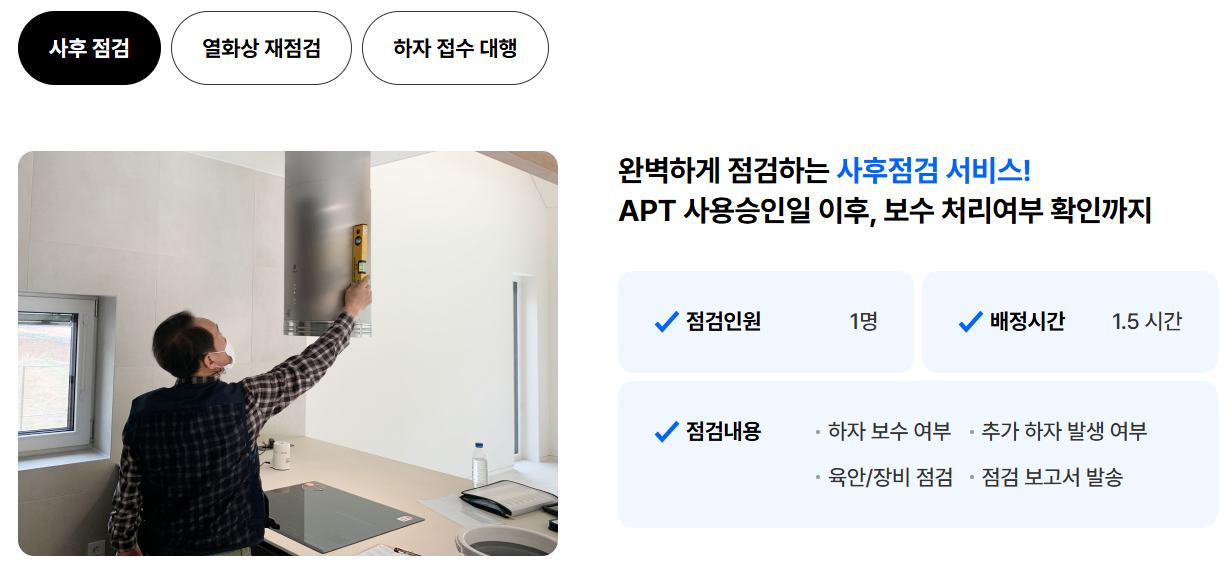특히, 눈에 보이지 않는 하자를 발견해주는 열화상 카메라 점검이나 전기 배선 검사는 많은 입주자들에게 큰 만족을 주고 있습니다. 또한, 하자를 발견하고 이를 바로 수리 요청할 수 있도록 도와주는 서비스는 입주자들에게 큰 도움이 됩니다.
