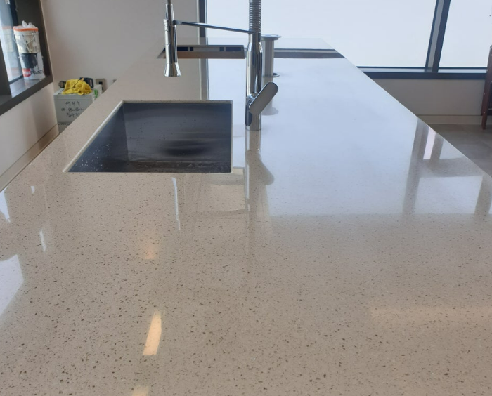 인조대리석보다 한 단계 업그레이드된 소재로, 천연 대리석에 가까운 외관을 제공합니다. 내구성이 좋고 유지관리가 비교적 쉽습니다. 90% 이상이 천연 석영으로 구성되어 있어 고급스러운 느낌을 줍니다.