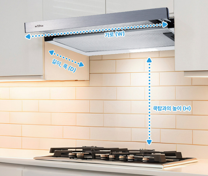 배기구와의 거리: 후드의 효율을 극대화하기 위해서는 배기구와 가까울수록 좋습니다. 후드와 배기구 사이의 거리가 멀어질수록 흡입 효율이 떨어집니다.