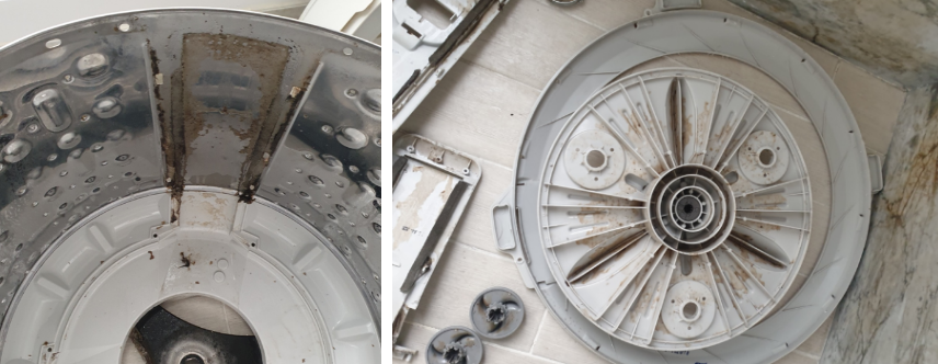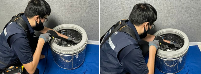 그 다음 전문 장비를 사용하여 분해한 세탁기 부품을 고압으로 세척합니다. 세척 후에는 모든 부품을 완전히 건조시키는데, 이는 추후 곰팡이 재발을 방지하기 위한 중요한 과정입니다.